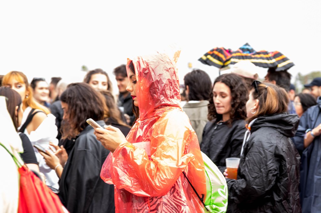 Los que ya estaban dentro, se refugiaron en las carpas de la zona de restauración, mientras que unos cuantos fieles seguían cantando y bailando bajo la lluvia en un espectáculo de colores que ofrecían los paraguas y chubasqueros de quienes se negaron a perderse un espectáculo que continuó hasta el final.