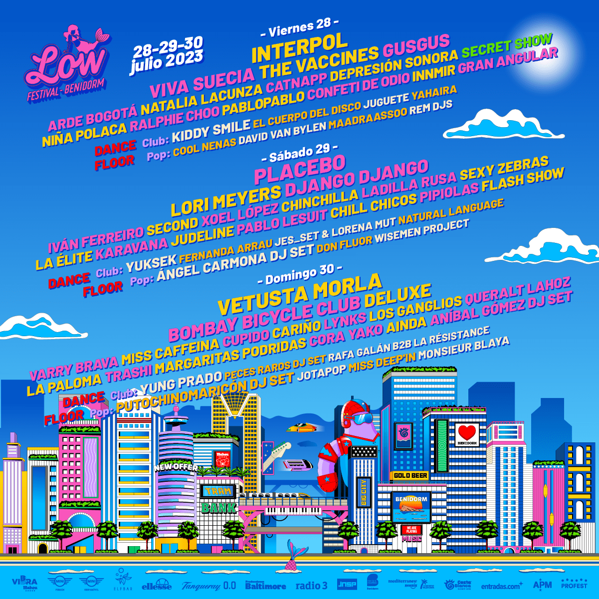 Interpol, Viva Suecia, The Vaccines, Arde Bogotá, Natalia Lacunza, Catnapp, Depresión Sonora, Niña Polaca, Ralphie Choo, Pablopablo, Confeti de Odio, INNMIR, Placebo, Lori Meyers, Django Django, Iván Ferreiro, Second, Xóel López, Ladilla Rusa, La Élite, Karavana, Judeline, Pablo Lesuit, Pipiolas, Vetusta Morla, Bombay Bicycle Club, Deluxe, Iván Ferreiro, Cupido, Cariño, Lynks, Queralt Lahoz, La Paloma, Trashi, Margaritas Podridas, Cora Yako, Ainda, Flash Show, Kiddy Smile, Putochinomaricón DJ set, Yung Prado, Peces Raros DJ set, Yahaira, El Cuerpo del Disco, GusGus, Secret Show, Chinchilla, Chill Chicos, Sexy Zebras, Los Ganglios , Aníbal Gómez DJ set, Juguete, Rafa Galán, B2B, La Résistance, Cool Nenas, Maadraassoo, REM DJS, David Van Bylen, Jes Set & Lorena Mut, Jotapop, Miss Deep’in, Monsieur Blaya, Fernanda Arrau, Yuksek, Don Fluor, Wisemen Project
