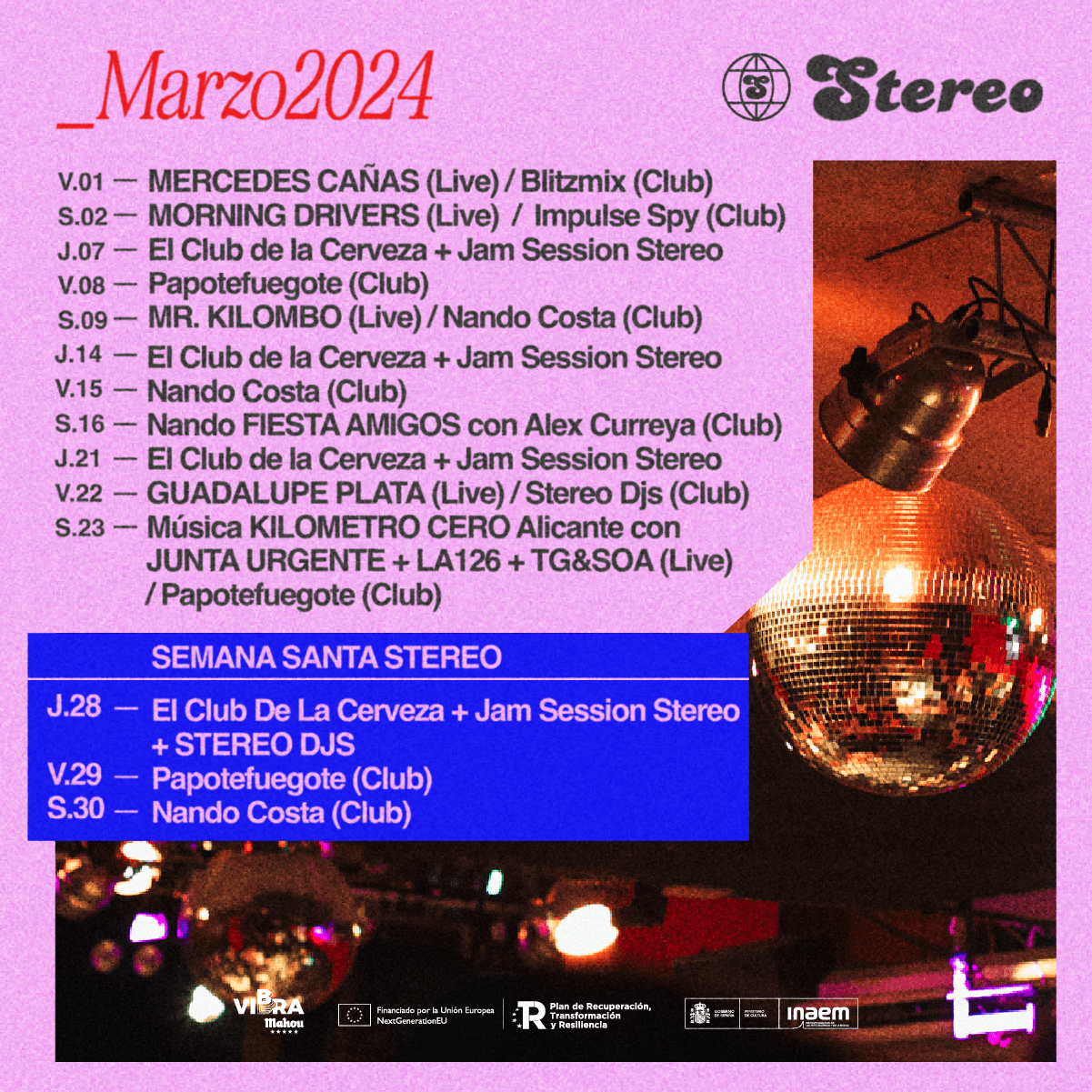 Vuelven los directos el viernes 22 de marzo a cargo de Guadalupe Plata que desde Jaén harán del escenario de Stereo Live una fusión de blues, jazz, psicodelia e incluso flamenco. Y ese mismo día, combo completo en la cabina de Stereo Club con Stereo DJs. El sábado 23, Stereo abre sus puertas para recibir “Música Kilómetro Cero Alicante” con Junta Urgente, LA126 y TG&SOA y una noche más, a partir de las 3:30h se acaba la noche bailando con Papotefuegote a los mandos.