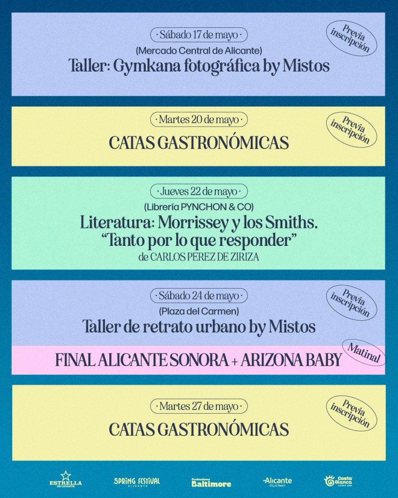 Ese mismo día 24 se celebra, también, la final de Alicante Sonora, la plataforma de Visibilidad y proyección a proyectos musicales locales,cuyas inscripciones están abiertas hasta el próximo 9 de mayo. En la final, las tres bandas seleccionadas compartirán escenario con Arizona Baby.